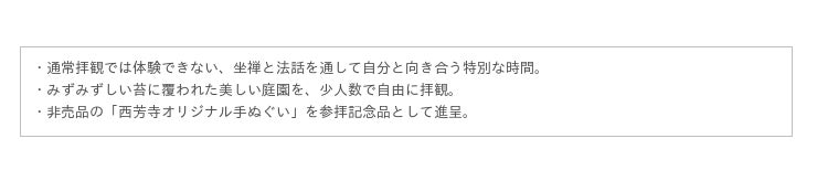 世界文化遺産であり、庭園を覆う苔の素晴らしさから「苔寺」と称される西芳寺。120余種の苔が生み出すしっとりとした空気に包まれながらの散策では、恵みの雨を受けて輝く様子、朝露と太陽に光る瞬間、午後の木漏れ日の中で見せる豊かな表情など、その日その日の庭園の姿に魅了されます。