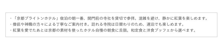 拝観場所は日替わりで、僧侶や神職の方々から境内をご案内いただいたり、お部屋で貴重な法話に耳を傾けたり、それぞれの寺社の魅力に触れることができます。帰館後には、和食または洋食から選べるホテル自慢の朝食を。秋の京都らしい美景と贅沢なホテルステイを堪能できるプランです。
