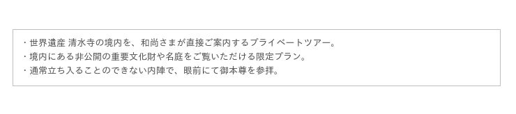 本体験では、重要文化財を含む通常立ち入ることのできない非公開の境内を、和尚さまがご案内。見て、聞いて、考える、清水の世界を全身で堪能できるプライベートツアーです。
