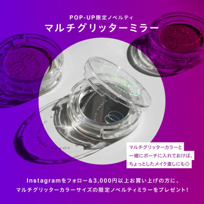 POPUP期間中3,000円(税込)以上お買い上げ&SNSアカウントをフォローしてくださった方を対象に、先着100名様にマルチグリッターミラー(鏡)をプレゼントいたします。大人気『マルチグリッターカラー』と同じサイズのミラーなので、ポーチに入れてちょっとしたお直しにも最適です。