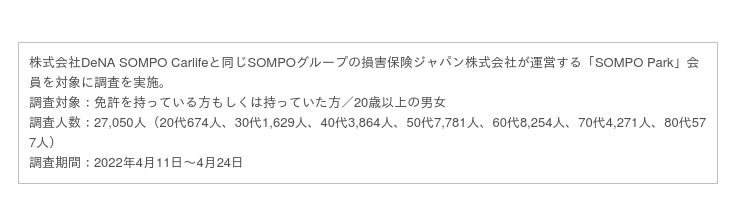 株式会社DeNA SOMPO Carlife(本社:東京都渋谷区、代表取締役社長:水沼 義尚)が提供するクルマ定額サービス※1「SOMPOで乗ーる」(https://sompo-de-noru.jp/)は、2022年5月13日からのサポートカー限定免許開始に先立ち、サポカーについての意識調査を行いました。