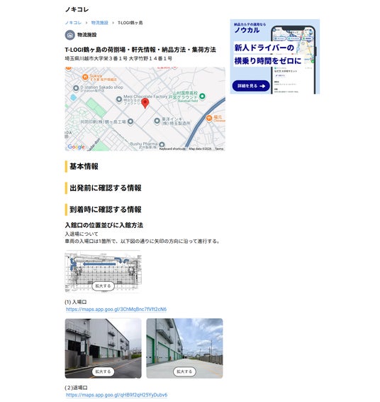 ノキコレは、納品場所の情報をウェブ上で簡単に検索、入力、閲覧・共有できるプラットフォームです。各施設ごとに個別のURLが発行され、ブラウザから誰でも必要な情報にアクセスすることができます。また弊社が提供する配送ドライバー特化SNS「ドラトーク」からもみることができます。