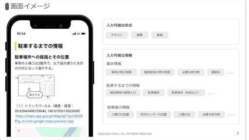 株式会社canuuは、物流業界のデジタル変革(DX)を推進し、配送ドライバー向けSNS「ドラトーク」、納品手順書管理SaaS「ノウカル」、軒先情報プラットフォーム「ノキコレ」を展開。特に、自社の軽貨物運送事業で培った鮮魚、青果、酒類といったB to Bの食品・食材領域における豊富な現場ノウハウをサービスに反映しています。この実績とDXサービスにより、軒先情報のデータベース化と共有を促進し、ラストワンマイルの非効率を解消。配送ドライバーの働き方改革と生産性向上を実現し、効率的で持続可能な物流エコシステムの構築を目指します。