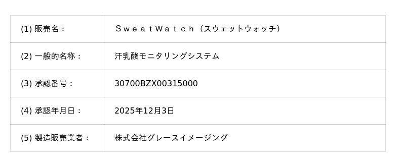 このたび株式会社グレースイメージング(本社:東京都新宿区、代表取締役社長:中島 大輔)は、汗中の乳酸をモニタリングすることで運動耐容能を評価する「SweatWatch(R)」の製造販売承認(薬事承認)を取得しましたので、お知らせいたします。