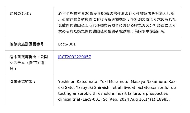 2023年2月24日付:慶應義塾大学医学部との共同研究グループにて「心血管疾患患者への汗乳酸センサを用いた新しい運動評価法の開発」を目的とした医師主導治験を実施、主要評価項目を達成 (Link)