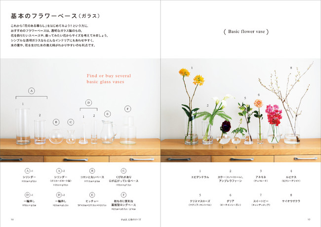 巻末には、花の手入れの基本を伝える「#花のABC」や、花店に並ぶ代表的な季節の花を解説する「12ヶ月の旬の花がわかる図鑑」を掲載、花の特徴を記号化するなどわかりやすく紹介しています。もちろん、これから花を飾ってみたい方にも役立つ、花を飾ることへのハードルが下がる一冊です。