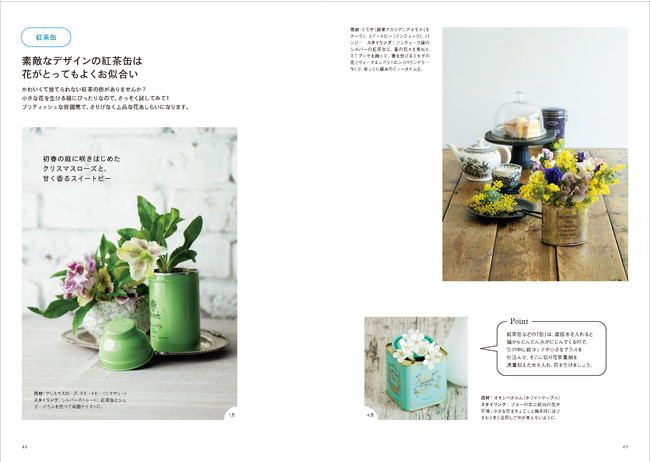 3章では、紅茶缶やジャムの空き瓶、食器、バスケットなどの身近な雑貨をリユースして、すぐにマネできそうな気軽に季節の花を飾るアイデアを多数掲載。