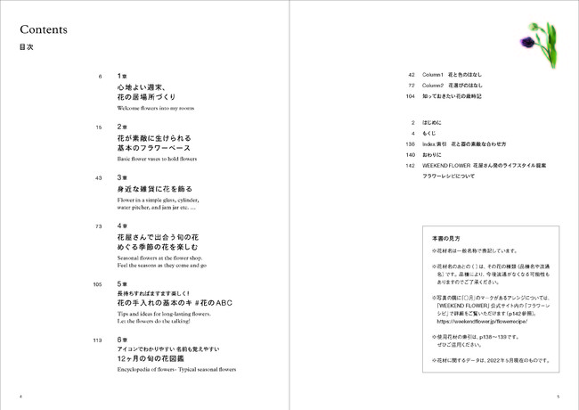 本書籍に掲載のフラワーアレンジは、花の専門雑誌『フローリスト』(誠文堂新光社)に、2017年1月号から2022年4月号まで5年4ヶ月間に渡り連載した「WEEKEND FLOWER」コーナーの256カットから130カットを抜粋・再編集したものになります。