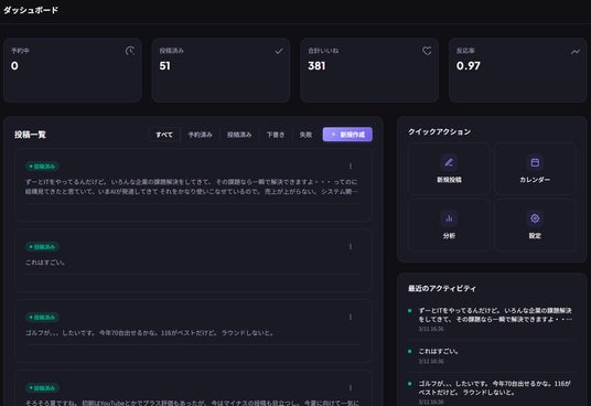 投稿一覧から、予約済み、投稿済み、下書き、失敗などのステータスを確認でき、運用状況を把握しやすくします。