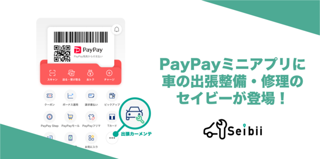 車の整備・修理出張サービス「Seibii(セイビー)」の開発・運営を行う株式会社Seibii(本社:東京都港区、代表取締役CEO:佐川 悠、以下、Seibii)は、PayPay株式会社(本社:東京都港区、代表取締役 社長執行役員 CEO:中山 一郎)が提供するキャッシュレス決済サービス「PayPay」のミニアプリを通じた「セイビー」のサービスを2022年1月18日より提供開始したことをお知らせいたします。これにより、PayPayのアプリをご利用の皆さまには、セイビーのご予約やお支払いなどの各種機能を、PayPayのアプリ上で完了いただけます。