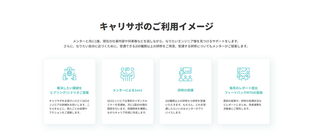 キャリサポは、SESエンジニアのキャリアパスを描くためのメンタリングと、キャリアを実現するために必要な研修を受講していただくサービスです。 SESエンジニア特有の自社と向き合う時間の少なさや、キャリアへの漠然とした不安を解消し、より長く働いてもらえる環境を整えます。