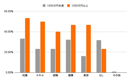アンケート結果から、自己投資への意欲は世帯年収が高い層ほど顕著であることが明らかになりました。特に、世帯年収別に調査したところ、「知識」「スキル」「経験」「健康」「美容」など、あらゆる分野において、世帯年収1000万円以上の層が圧倒的に自己投資意欲が高いことがわかりました。