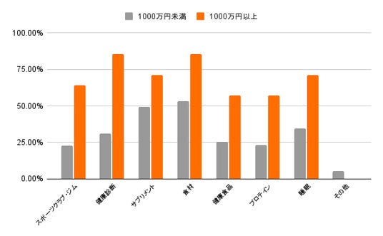 - 世帯年収1000万円以上の層は「プロテイン」「ジム」「健康診断」に投資する人が2倍以上