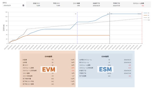 プロジェクトのコストやスケジュールについて予定、進捗、実績をチャートや数値で比較することができます。