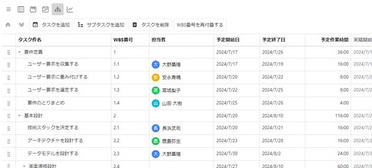 プロジェクトに必要な作業全体を階層構造で表現し、タスクの予定作業日や予定作業時間、担当などを簡単に追加・修正できます。