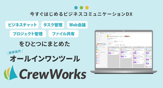 CrewWorksは、「ビジネスに必要なツールをこれひとつで」をコンセプトに開発されたビジネス向けの新しいコミュニケーションサービスです。 ビジネスチャット・タスク管理・Web会議・ファイル共有など、ビジネスでよく使われるツールがオールインワンで提供されるため、社内外とのコミュニケーションをひとつのサービスで完結させることができます。