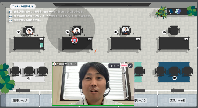 そこで、当社ではコミュニケーション量を増やすため、2022年12月からメタバースを生徒用にテスト導入。講師の状況が生徒にリアルタイムに可視化されたことで、コミュニケーションが活発になるという成果が出たため、この度本格導入することとなりました。メタバースはチャットとWEB面談との中間地点のような存在です。以前から社内のリモート従業員用に活用し、「家でも仕事の雰囲気に変わる」「チャットよりも正しいニュアンスで伝わる」「気軽に話しやすい」などの効果が出ていたメタバースを生徒と講師間でも活用できるのではと考えて導入したところ、これまでは「WEB面談するほどでもない」「チャットだと説明しにくい」からと講師への相談を後回しにしていた生徒が、「先生の状況がみえる」「話しかけやすい」と行動に移せるようになりました。さらに、元々コミュニケーションが苦手な生徒でも、「WEBだから直接よりも緊張しない」「気軽に質問できる」と活用しています。