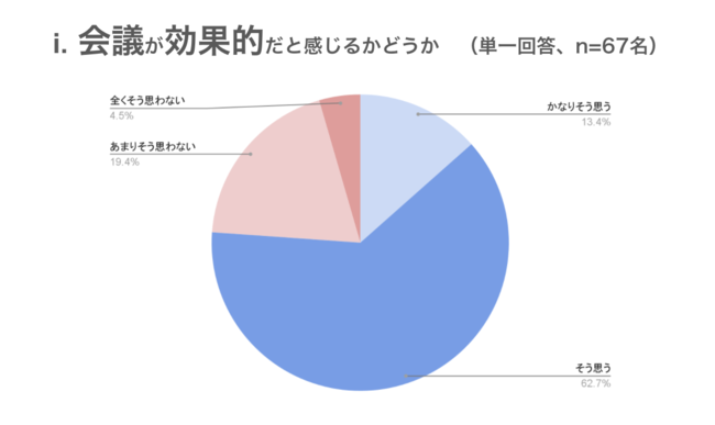 「会議が目標達成に対して効果的だと感じるか」という質問に対して、合計76.1%が「かなりそう思う(13.4%)」「そう思う(62.7%)」と回答したのに対し、合計23.9%が「あまりそう思わない(19.4%)」「全くそう思わない(4.5%)」と回答し、回答者全体の約1/4において効果が十分に実感されていない状態で会議が行われている実態が明らかになりました。