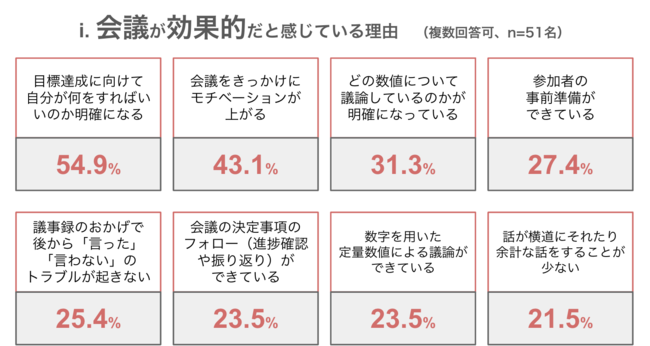 「会議が効果的だと感じている」と回答した51名を対象に、「会議が効果的だと感じている理由」を聞いたところ、以下の回答を得ました。「会議をきっかけにモチベーションが上がる」「どの数字に関して議論しているのかが明確になっている」など、会議の内容や、会議によるポジティブな心境の変化が、会議の効果の体感のために重要な要素であることがわかりました。