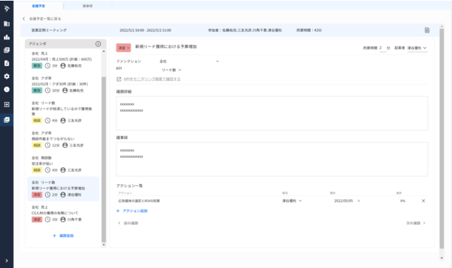 会議アジェンダごとに議事録を残すことができ、また、議論して決定したアクション施策やその担当者を各KPIに紐づけることができる点