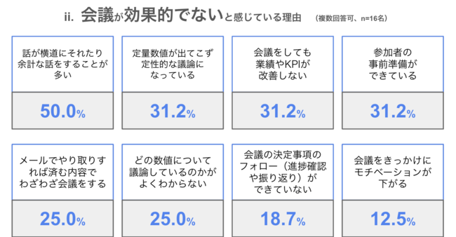 「会議が効果的でない」と回答した16名を対象に、「会議が効果的でないと感じる理由」を聞いたところ、以下の回答を得ました。「話が横道に逸れたり余計な話をすることが多い」「数字があまり出てこずに定性的な議論になってしまっている」「参加者の事前準備ができていない」「会議をしても業績やKPIが改善しない」など、会議の内容への疑問視や、会議によって生まれる業績向上がないことなどが理由として挙げられました。