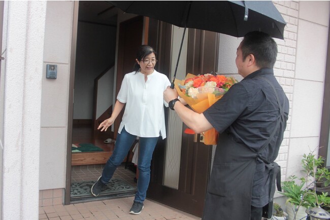 土屋太鳳さんデザインの花束とサイン入りポスターを受け取ったお母様は「娘とキャンペーンの写真を見て、素敵なデザインの花束で、これが欲しいと話していました。すごい!写真のとおりですね」と花束のご感想を、そして、ポスターをじっと見つめると「太鳳ちゃんの字ですね」とおっしゃり、「ほんとにありがとうございます」と涙を流して感激されていました。