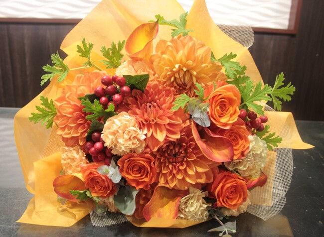バラをメインにカーネーションやダリア、カラーなど全体をオレンジ色で統一しています。土屋さんの意向をもとに、花キューピットのフローリストがサポートしながら制作しました。花の種類や色合いはもちろん、花束を包むペーパーやリボンにいたるまで、こだわって仕上げています。制作中の土屋さんは、楽しそうな笑顔で、また時には真剣な表情で考えこみながら、完成させていきました。