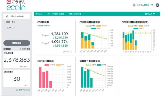 「ecolnダッシュボード」は導入企業全体においてリアルタイムのエネルギー使用状況やGHG排出量を可視化し、脱炭素経営の実現に向けた目標設定及び現状の進捗把握など各種取組の推進を支援すると共に、SDGsやESG/IR関連など社内外に向けた報告業務の簡略化、経営判断の迅速化などに貢献しています。