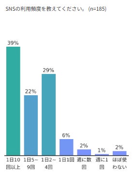 利用頻度に関しては、1日10回以上SNSを利用する人が38.9%と最も多く、全体の約9割が1日複数回利用していることがわかりました。