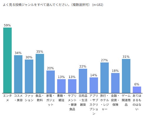 よく見られている投稿ジャンルは「エンタメ」が最も多く、「食品・飲料」「美容」「ゲーム」「ファッション」などが続いています。