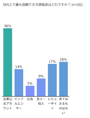 信頼できる情報源としては、「企業公式アカウント」が最も多く挙げられ、「レビューサイト」「インフルエンサー」「友人・知人」などが続きました。信頼性を重視する層と、共感を重視する層の二極化がうかがえます。
