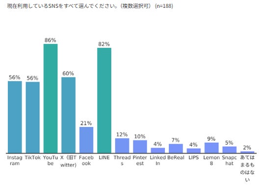 SNSに関する調査(回答者188名)では、最も多く利用されているのはYouTube(161名)で、続いてLINE、X(旧Twitter)、Instagram、TikTokの順でした。