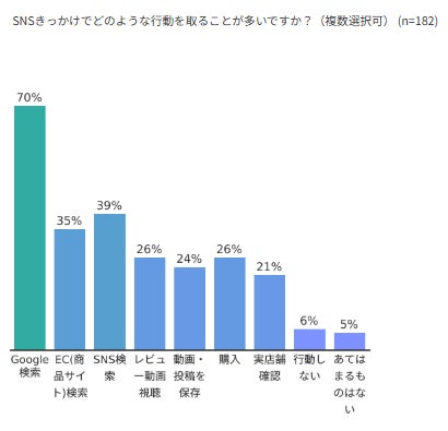 SNSで見かけた商品やサービスについては、「Google検索」や「SNS内検索」で調べる人が多く、即購入に至るケースは全体の1割程度にとどまりました。SNSは主に情報収集や検討のきっかけとして活用されていることがわかります。