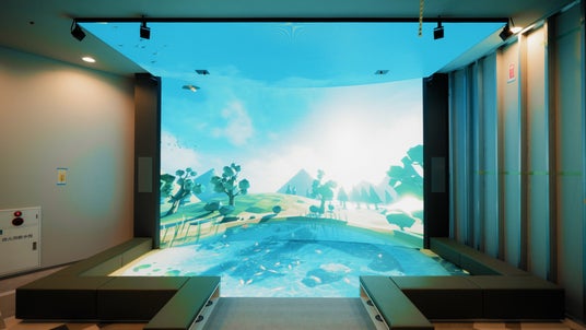 壁面は湾曲しており、ビジョン中央に立つと包み込まれるように感じられます。フレキシブルタイプのLEDビジョンは採用せず、平面タイプのLEDビジョンを角度をつけて設置し、湾曲を作り出しました。