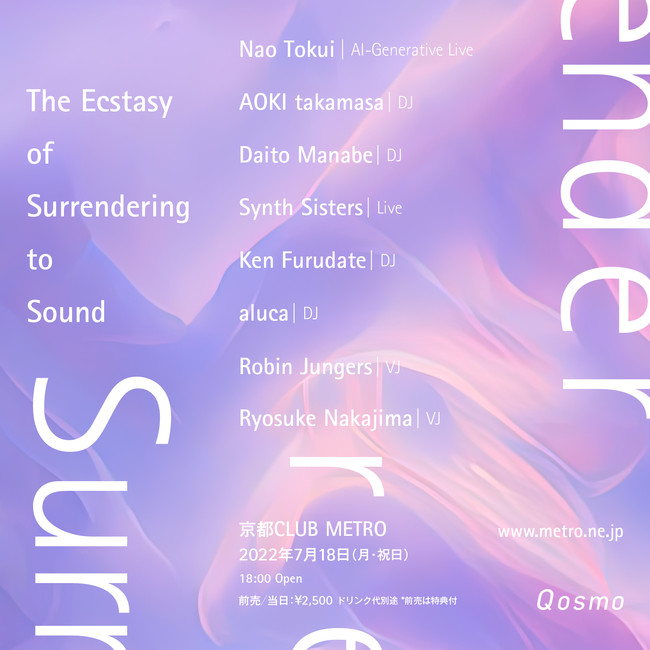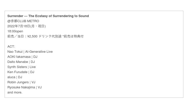 7月18日(月・祝日)に、本展覧会の開催を記念して、京都CLUB METROにてスペシャルライブイベントを開催します。Qosmo代表の徳井直生(Nao Tokui)は、AI音響合成を用いたAI Generative Live Setを初披露、更にAOKI takamasa、ダムタイプKen Furudate、aluca、Synth Sistersの豪華共演が実現しました。さらには、ライゾマティクスの真鍋大度の参加も急遽決定!本イベントの前売購入者及びメール予約者特典として、「BRIAN ENO AMBIENT KYOTO」展優待ディスカウント券(200円OFF)をプレゼントいたします。