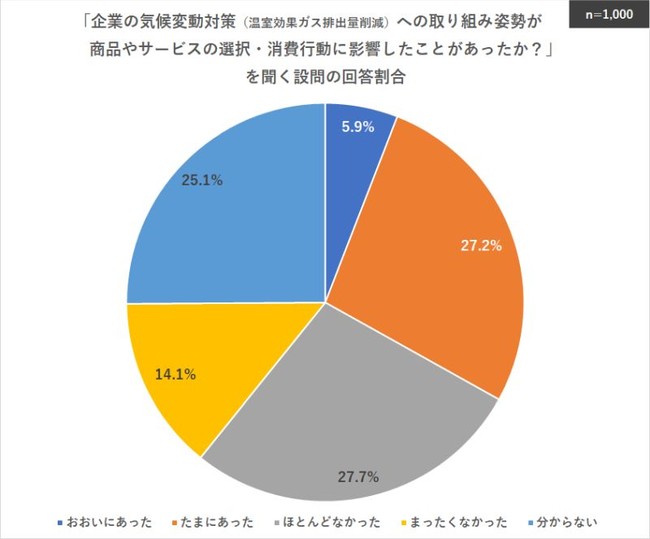 その1問目として、「企業の気候変動対策(温室効果ガス排出量削減)への取り組み姿勢が、商品やサービスの選択・消費行動に影響したことがあったか?」を聞く質問を行い、その結果は、「おおいにあった」との回答が「5.9%」、「たまにあった」が「27.2%」であった。