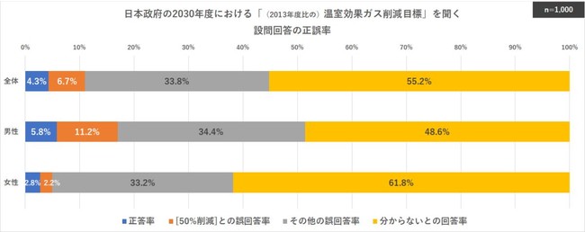 ● 日本政府の2030年度における「温室効果ガス削減目標」を聞く設問に対する正答率は、わずか4.3%。