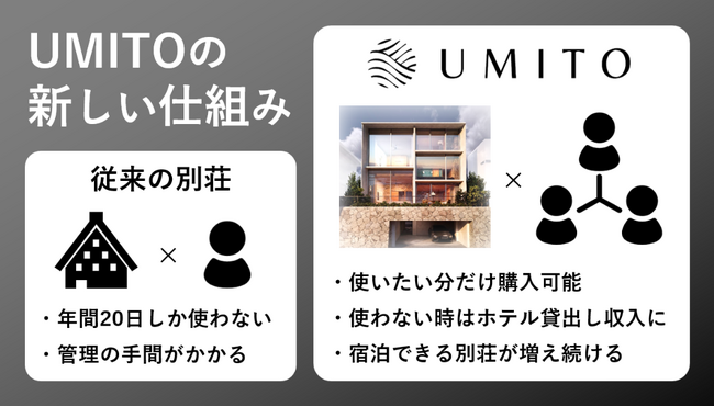 「UMITO」シリーズは、別荘とホテルのメリットを組み合わせた新しい仕組みの別荘です。