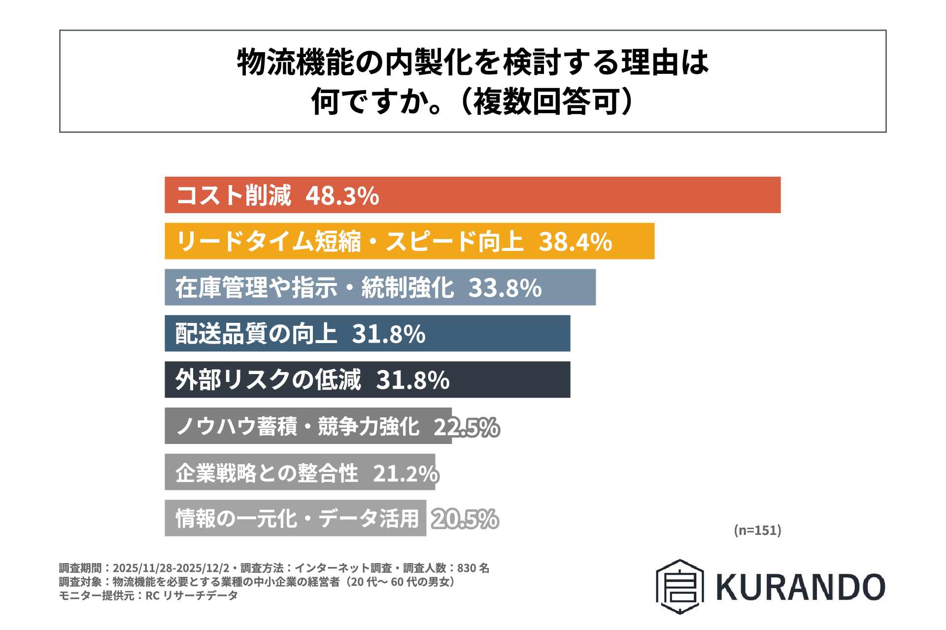物流の「2024年問題」や燃料費・人件費の高騰を受け、大手小売チェーンなどの大企業を中心に、物流機能を「内製化」し、コストコントロールとサプライチェーンの安定化を図る動きが見られます。一方で、国内企業の大多数を占める中小企業においては、リソースの違いから、大企業と同様に内製化へ舵を切れているかは不透明です。そこで、株式会社KURANDOは、物流機能を必要とする中小企業の経営者を対象に、「物流機能内製化への意識と障壁に関する調査」を実施しました。