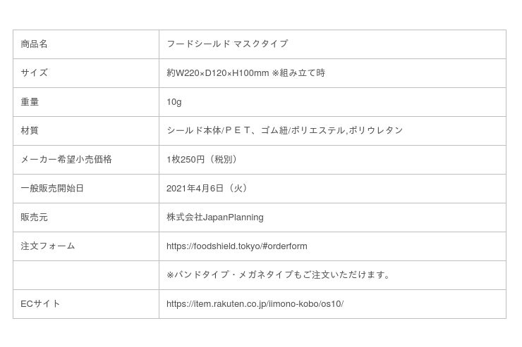 少しでも安心して食事ができる様式の確立を目指し、食事中の感染防止対策にこだわり、食事専用「フードシールド」シリーズを開発している株式会社JapanPlanning(東京都渋谷区)は、飲食店からの要望に基づき、これまで開発してきたフェイスシールドタイプではなく、軽量コンパクトなマスクタイプをシリーズ第三弾として開発し、2021年4月6日より、自社サイトほか、楽天市場などのECサイトでも一般販売開始いたします。