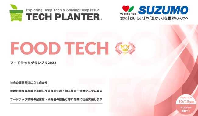 大学や研究機関、企業の研究所では科学技術の「種」が生まれていますが、実用化に向けて芽を出すまでに大変な努力を要します。リバネスならびにパートナー企業によって開催する「テックプランター」は、これを発掘し、ビジネスまで芽吹かせるプランターとしての役割を担うことを目的としたエコシステムです。「フードテックグランプリ2022」は、リアルテック領域(持続可能な食産業を実現しうる食品生産・加工技術・流通システム等)の技術シーズと起業家の発掘育成を目的としたプログラムです。