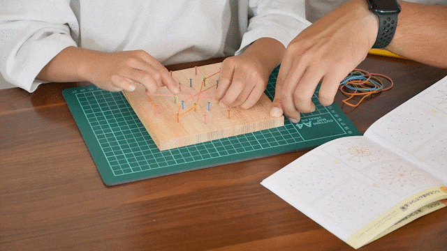 板に釘を打ち、打った釘に輪ゴムをかけてさまざまな図形を作る遊びです。