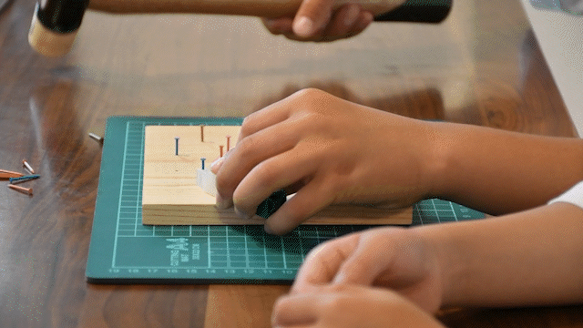 釘打ちは図工指導要領で小学3~4年生に推奨されている要素のひとつ。付属のネイルガイドを使えば釘を直接持たずに釘打ちができます。ハンマーで手を打つ心配が減るので、釘打ちがはじめての方にもおすすめです!