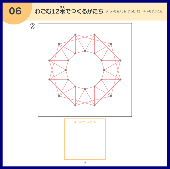 誰でも何通りもの幾何学模様を表現することができる『ごむかけ』は、ストリングアートの糸口としても、算数の面白さを知る最初の教材としても新しい刺激をもたらしてくれます。
