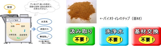 「バイオトイレ」は水を使わず、人の排泄物を 微生物(バイオ)の力で分解・処理する、水洗トイレの概念とは全く異なるトイレのことです。また、当社のバイオトイレに採用した基材は、「アシドロ コンポスト分解方式」は、東北大学大学院工学研究科バイオ工学専攻の西野徳三教授(現名誉教授)、中山亭教授と当社の共同開発から生まれた、画期的な堆肥化(コンポスト化)方式です。