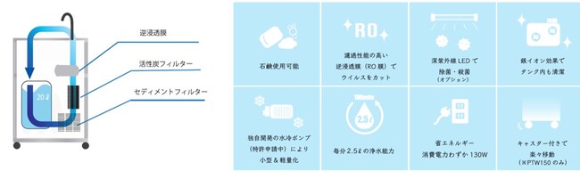 電源をつなぐだけで、綺麗にろ過された水を再利用することができる、洗面器です。逆浸透膜の特性を活かし、独自のろ過システムで水を循環させることで、蛇口からは常に「きれいな水」を提供いたします。手垢や髪の毛などはもちろん、菌やウィルス、洗剤などもしっかりと除去します。循環利用型のため、わずか12Lの水で利用が可能です。