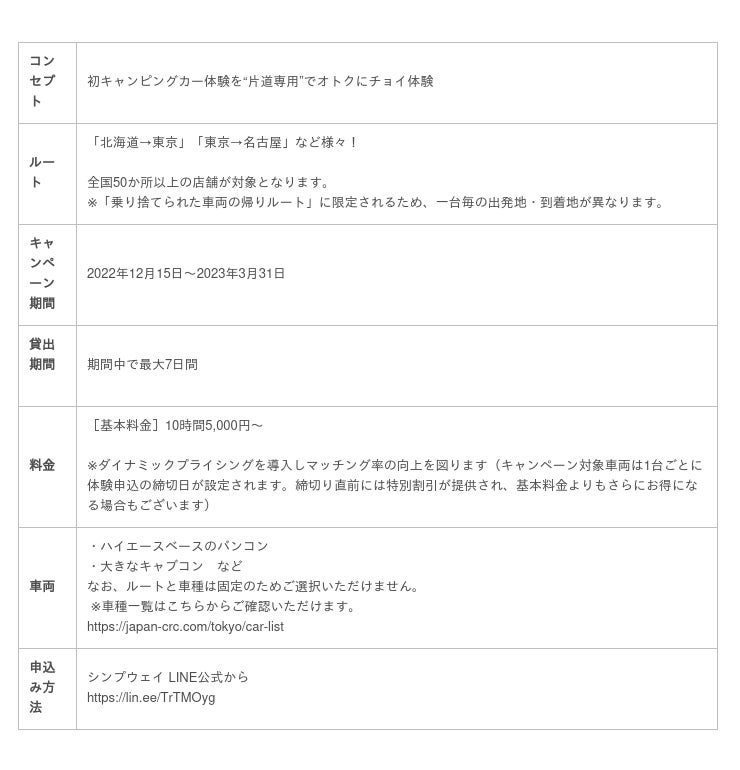 本キャンペーンは、レンタカーとして使用された回送車両のキャンピングカーをユーザーとマッチングさせることで、「片道専用レンタカー」としてキャンピングカーの体験機会を提供することを目的としています。主にキャンピングカーのレンタカー未体験のユーザーを対象としており、通常仕様のキャンピングカーを格安で体験いただくことが可能です。