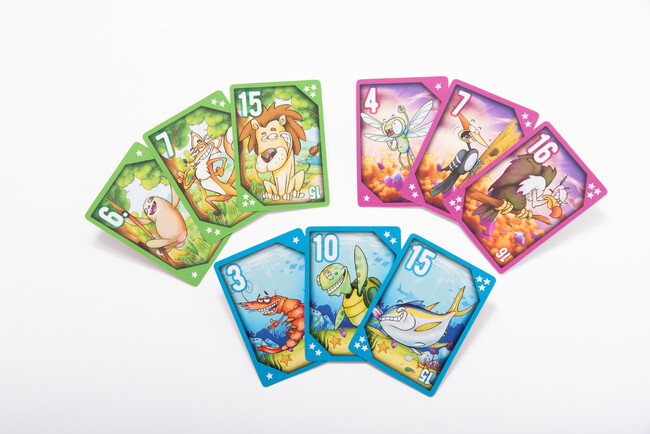 『うみぞら ~海と空と大地でどうぶつたちが割り込みをしようとして「お前らいい加減にしろ!」と言いたくなるゲーム~(以下『うみぞら』)』は海、空、大地の3つの列に、1~18の数字の書かれた『どうぶつカード』を順番に出し合うカードゲーム。スキあらばワリコミで得点を奪ってくる動物にイラッときたら、こちらもワリコミして奪い返そう!