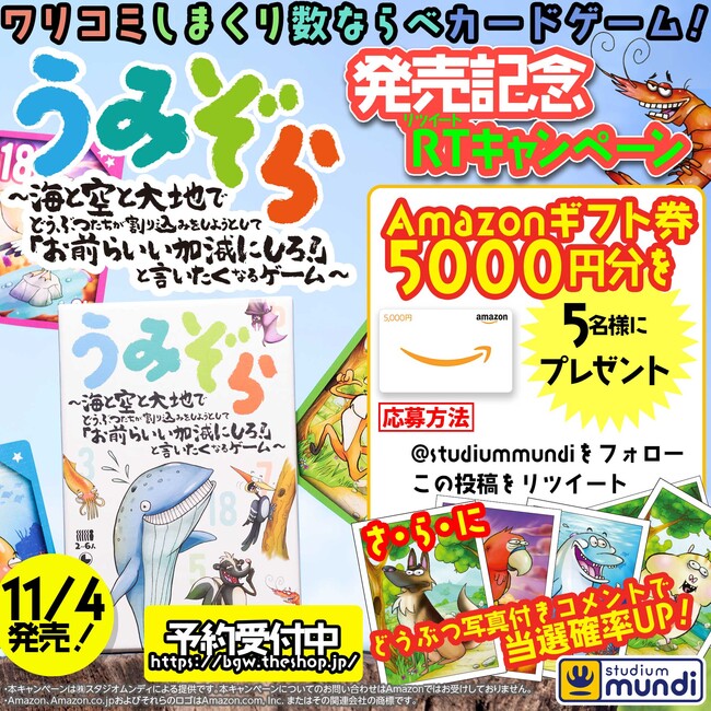 株式会社スタジオムンディ(東京都港区 代表取締役:松本健)は、新作カードゲーム『うみぞら ~海と空と大地でどうぶつたちが割り込みをしようとして「お前らいい加減にしろ!」と言いたくなるゲーム~』を2022年11月4日(金)より発売開始することをお知らせいたします。希望小売価格1,980円(税込)。