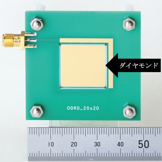 Orbray株式会社は、独自のステップフロー成長法*3を用いて直径2インチの高品質(100)ダイヤモンド自立基板(商品名:KENZAN Diamond(TM))を開発したことを、2021年9月9日にプレスリリース*4で発表しました。このダイヤモンドを用い、東京都立大学、東北大学、東北工業大学、大阪大学と共同で図1に示すダイヤモンド放射線検出器を開発しました。医療現場で使用される放射線照射装置を用いて評価を行い、放射線検出器感度が高く、分光特性にも優れることを実証しました。また、図2の世界最大級の20mm角の大面積ダイヤモンドを用いた超高感度検出器を試作しました。今後はユーザーの評価を進めながら製品開発を進めます。
